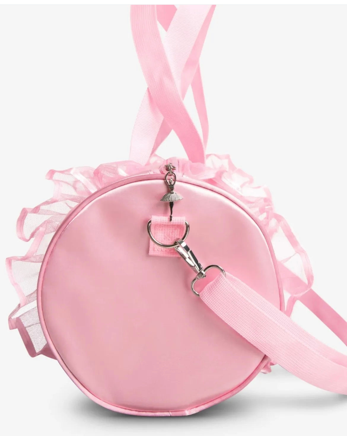 Capezio Ballet sequin barrel bag in pink with ruffle detail.