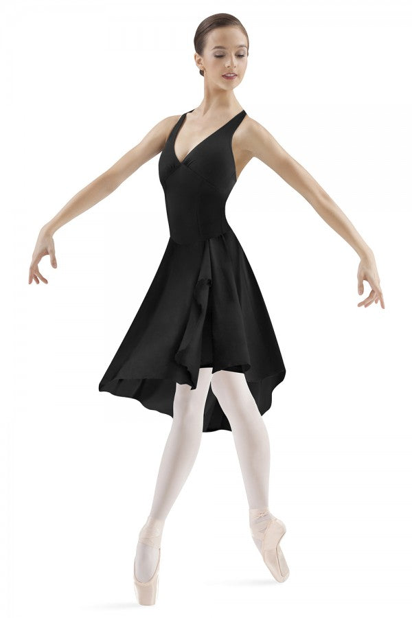 Show off your beautiful back in this stunning halter neck dancesport dress! Pinch front bust, empire waistline, and princess seams add style to this beautiful dress. Attached asymmetrical skirt gives volume and shape while dancing. Side slit over left leg completes the look.