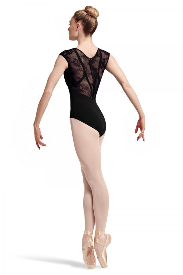Beautiful cap sleeve leotard features striking lace and ribbon back detail.