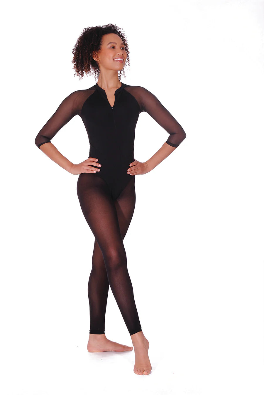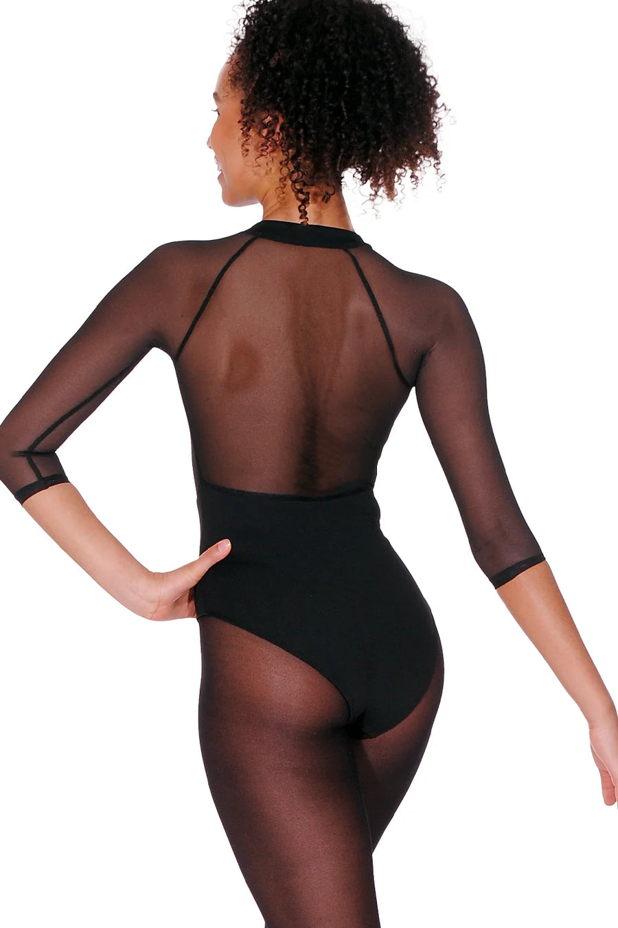 Roch Valley Microfibre three quarter length sleeved turtle-neck leotard with front zip, mesh back panel & sleeves. Fully front lined.