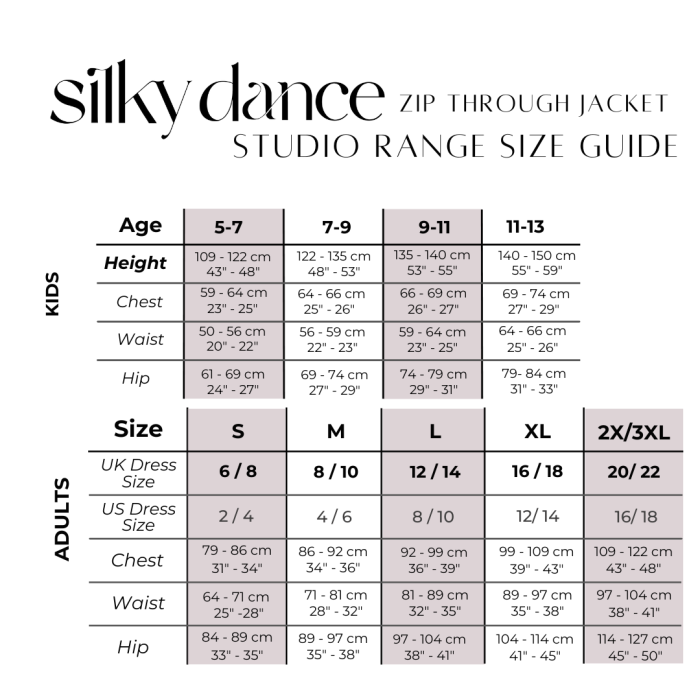 Wide Range of Sizes: Available from children’s 5-7 years to ladies’ adult 2XL-3XL, accommodating all team members. - Customisable: Enhance your brand identity by adding your studio or school logos. This feature makes the Silky Dance Zip-Up Crop Jacket a perfect choice for team uniforms and promotional apparel.